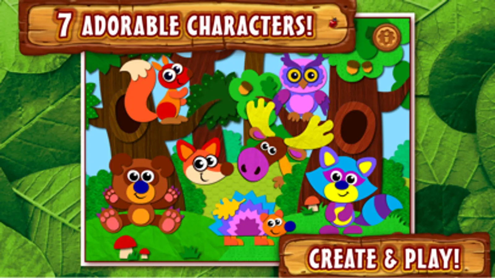 Puzzle Game for Kids enables your children to develop fine motor skills, enhances their creativity and imagination, and helps them to stay focused. This game gives your children a wonderful peek into the natural world around them and introduces forest animals and their habitat. Your child can make new friends from the forest: a fox, a raccoon, a moose, an owl, a squirrel, a hedgehog and a bear.