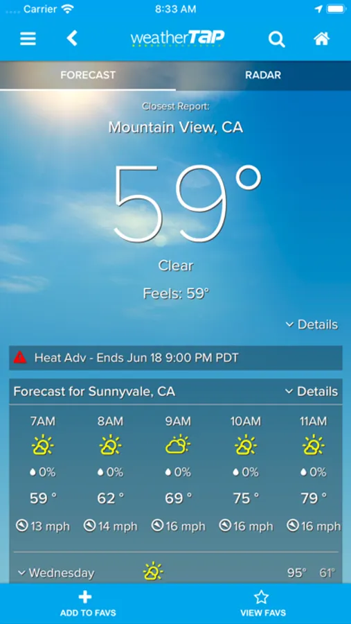 • Current local forecast, hourly forecast and local radar geo-located to your location