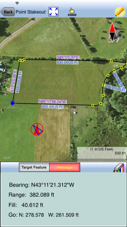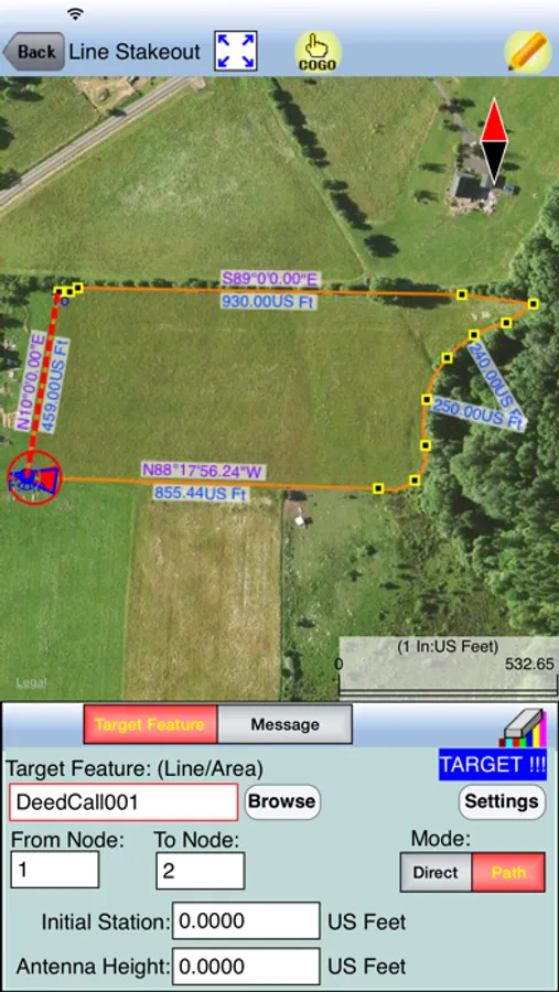 The Stakeout functions in the Deed Calls & Stakeout app will enable you to stakeout the deed plot you have created using the Deed Calls functions. The Point Stakeout function will help you stakeout the individual nodes on the deed plot. The Line Stakeout function will guide you in moving parallel to the outline of the deed plot. You can turn the navigation beeps on or off as you wish.