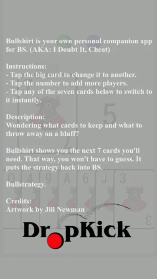 Bullshirt is a personal companion app for the physical card game of BS (AKA: I Doubt It, Cheat) that shows you the next seven cards you'll need. That way, you don't have to guess.