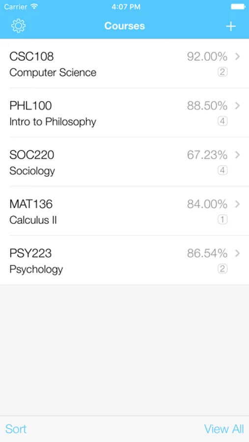 * See a summary of your current progress in each class along with your average, cumulative grade (minimum possible grade), and maximum possible grade.