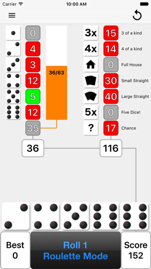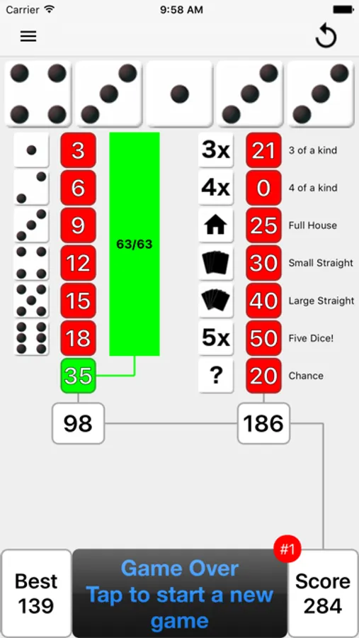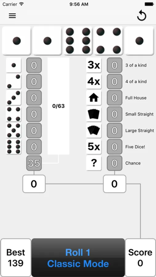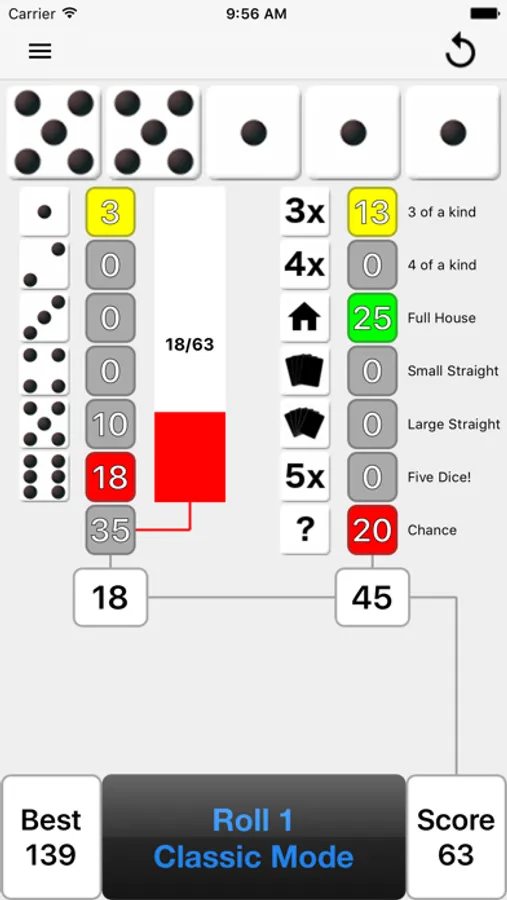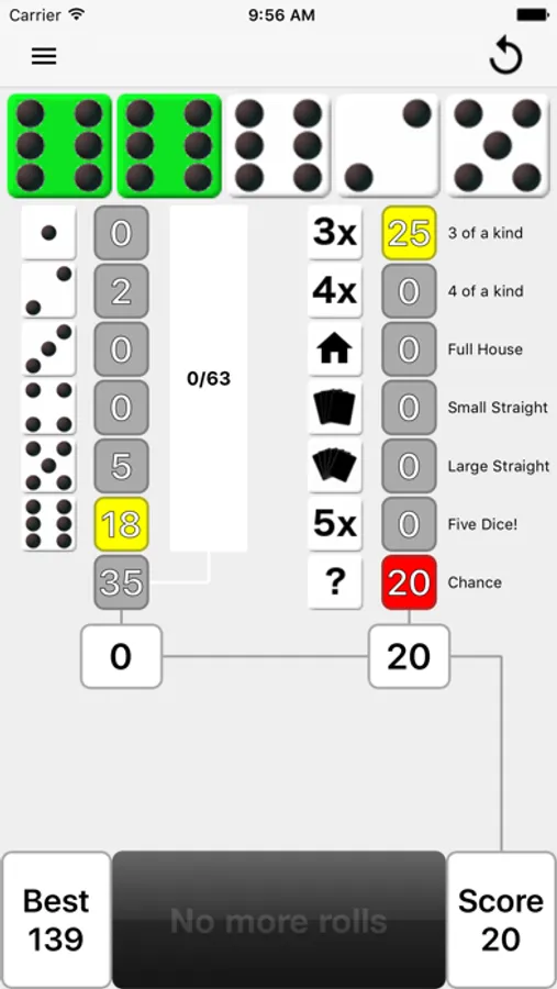 After each roll, all valid scores are highlighted in yellow so you can quickly decide where to apply the results. Where you place the score from each roll is up to you. There are thirteen turns of 3 rolls each per game. After each roll you can choose which dice to keep by touching them, then the remainder will be included in the next roll. At the end of the 3 rolls, you must assign the score before you can move on to the next turn. The first Five Dice (5 of a kind) is worth 50 points and each subsequent Five Dice will be rewarded with a 100 point bonus. If you score 63 or greater on the left side of the score card, you will get a 35 point bonus.