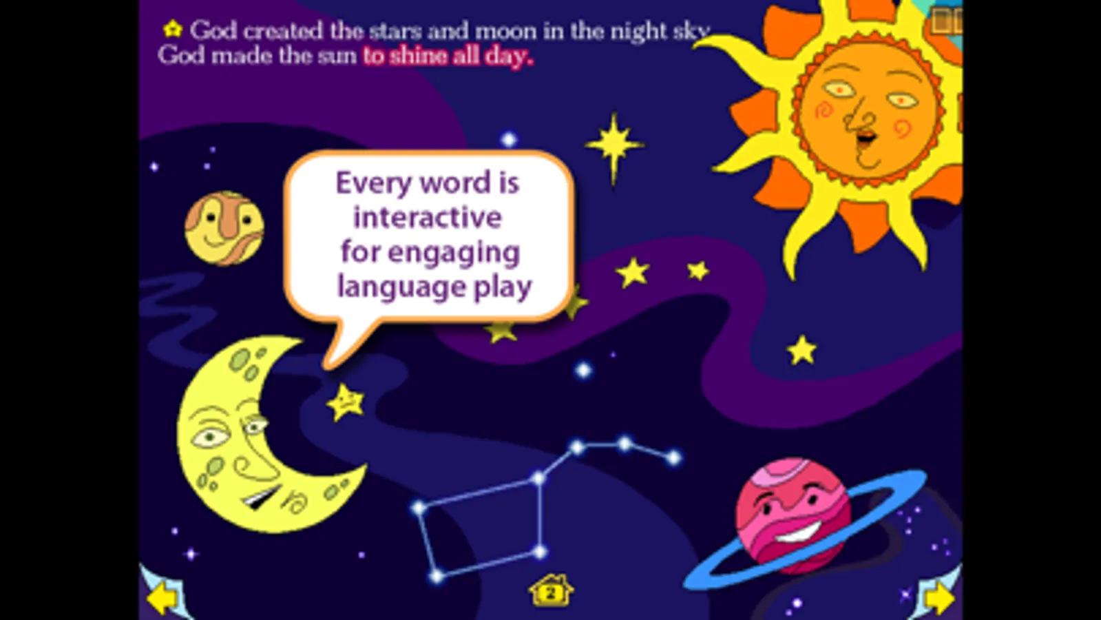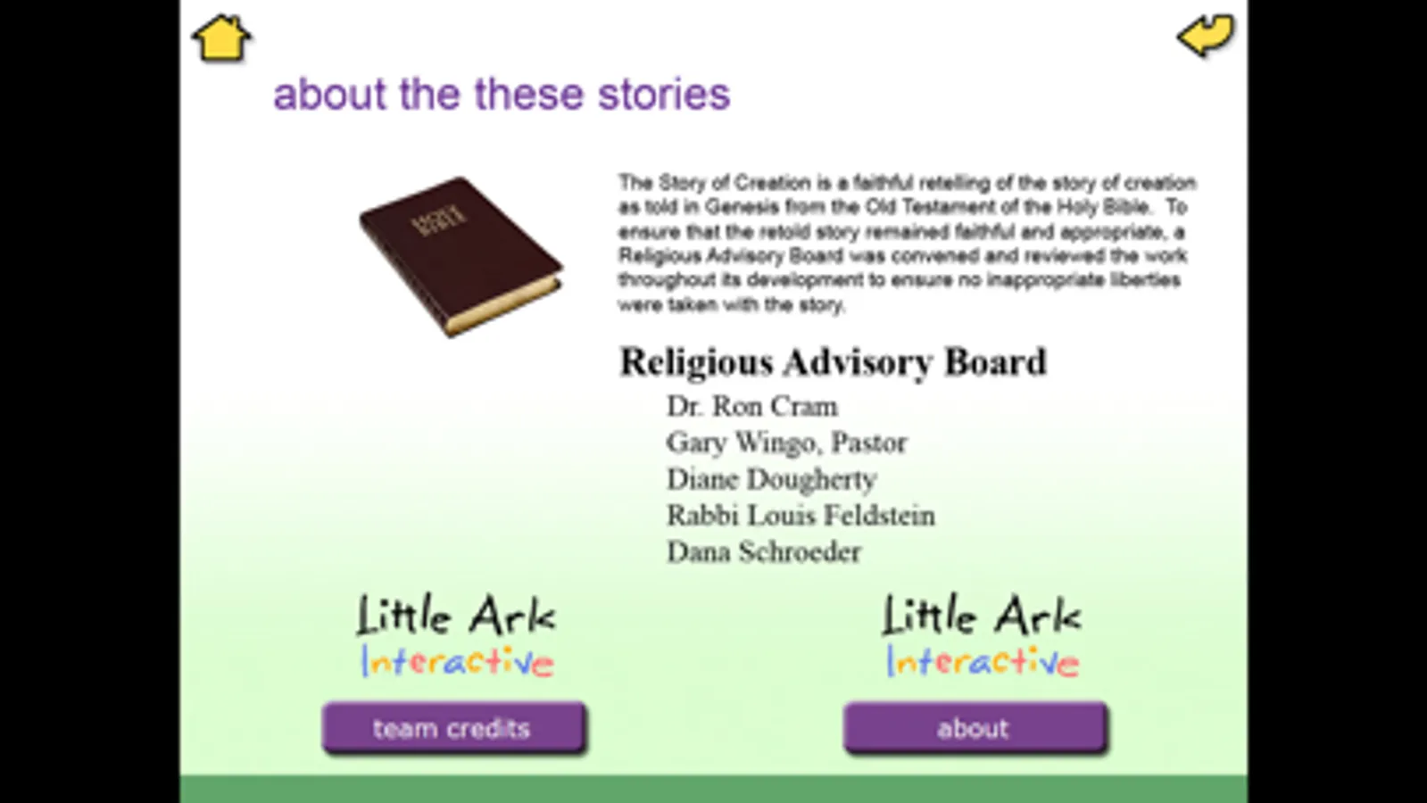 Little Ark Interactive's goal is to help children discover a lasting love of language through story exploration and learn important stories and lessons from the Bible. We hope The Story of Creation provides your family, children and students with hours of delightful story play.