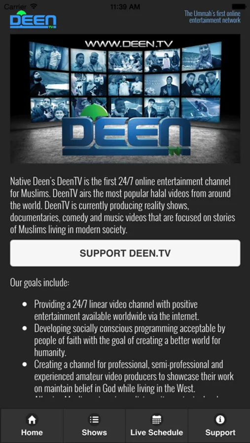 DEEN.TV is the first online halal entertainment channel streaming the best halal entertainment 24/7 to your computer, tablet or mobile phone. DEEN TV airs the most popular halal videos from around the world. You can watch DEEN.TV online at www.deen.tv or through this mobile app.