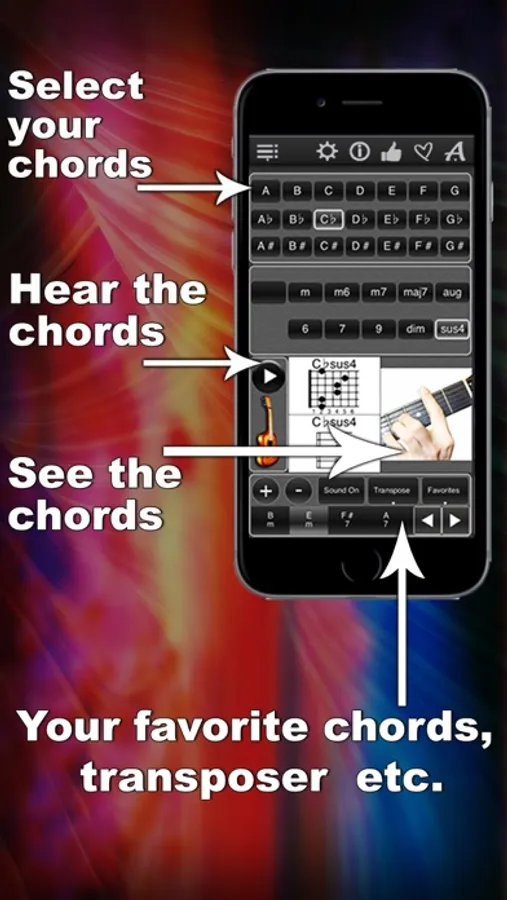 - see the chords in standard string representation, in TAB-representation, and as colored photos,