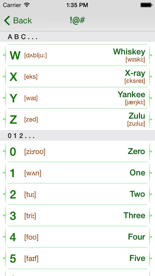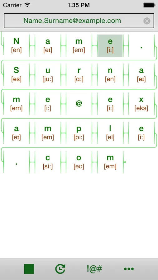 Spell in english letters, numbers, signs and characters. Type an e-mail, name or somthing else and it will be spelled. An application supports: