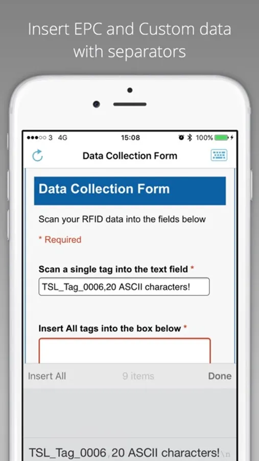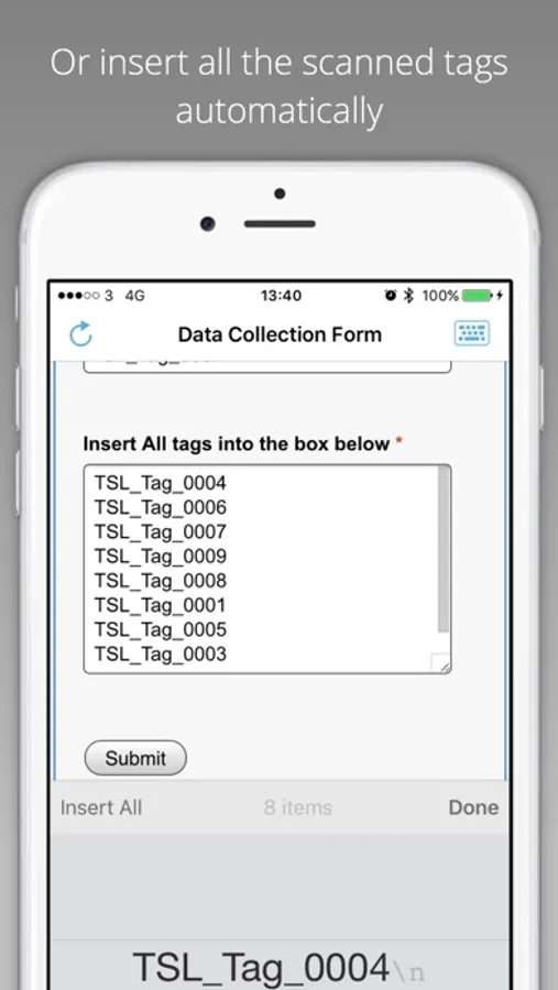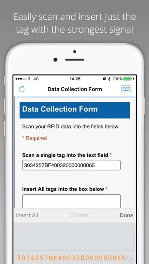 • Continuous Scan mode to inventory large tag populations and insert all tag data with a single tap