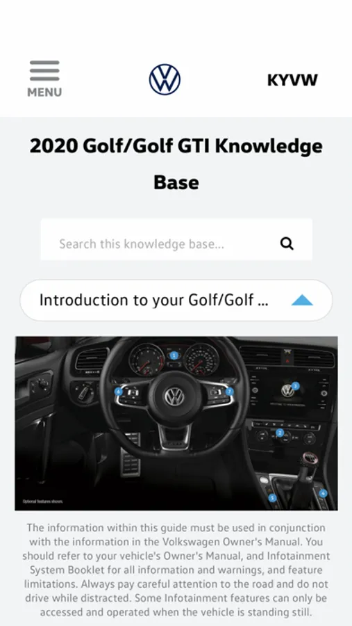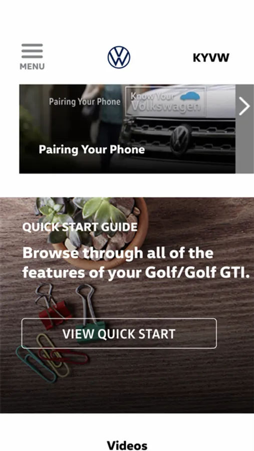 Know Your VW offers easy to use information about Volkswagen models. Here you can access tutorial videos on features, view a virtual tour of the interior, view your vehicles Quick Start Guide, and chat with a Volkswagen representative.