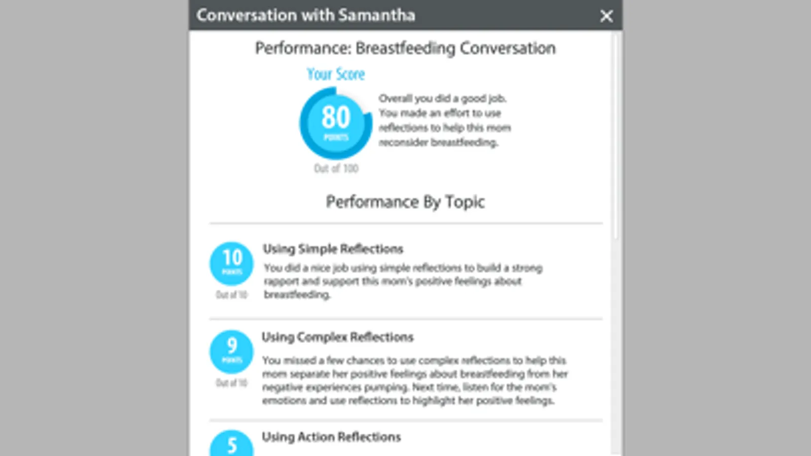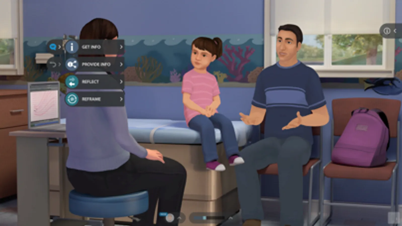 - Learn by engaging in a series of simulated role-play conversations with fully animated parents and their children, while receiving personalized feedback from a virtual coach