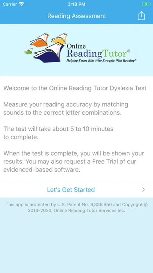This app is protected by U.S. Patent No. 9,386,950 and Copyright © 2014-2017, Online Reading Tutor Services Inc.