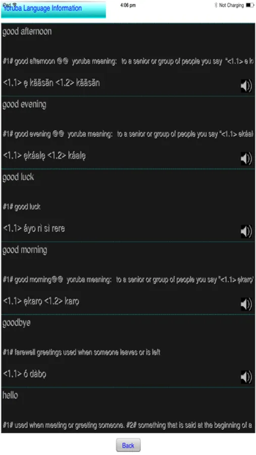 Dialog audio data helps to elaborate on the translated Yoruba data and may be used to teach the user what to expect in reply to what they are saying to local speakers of the language.