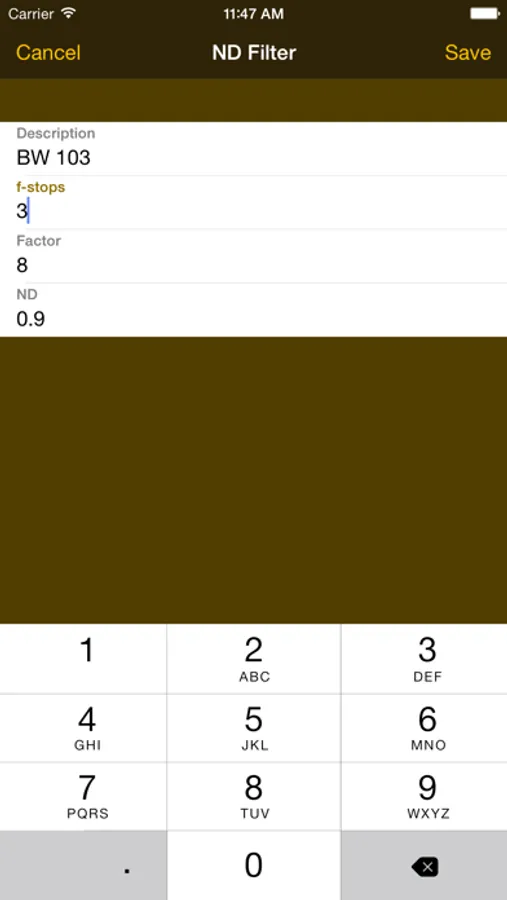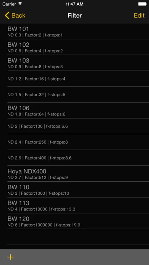 - Add your own Filters! Finally! You own a filter which is not listed in the default list? Just add it by f-stops, ND-Value or Factor.