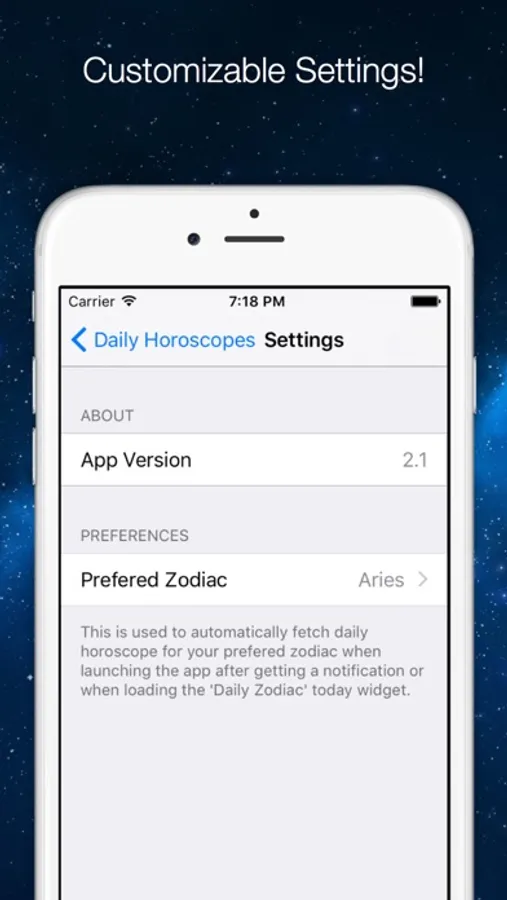 2. The user can navigate to application Settings to select the preferred zodiac sign and a daily notification will remind to check the daily updated horoscope. When the app is launched from the notification alert, the app will automatically fetch the horoscope for the selected preferred zodiac.
