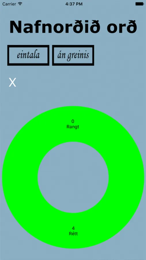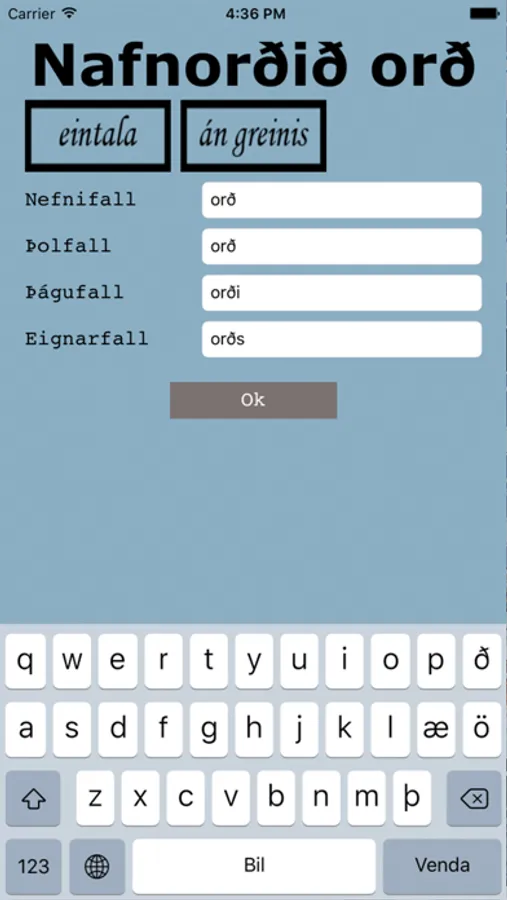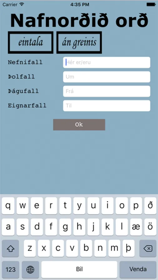 Appið Íslenska er fyrir þá sem vilja æfa sig í fallbeygingu. Hver leikur samanstendur af mismunandi orðum sem þarf að fallbeygja í nefnifalli, þolfalli, þágufalli og eignarfalli.