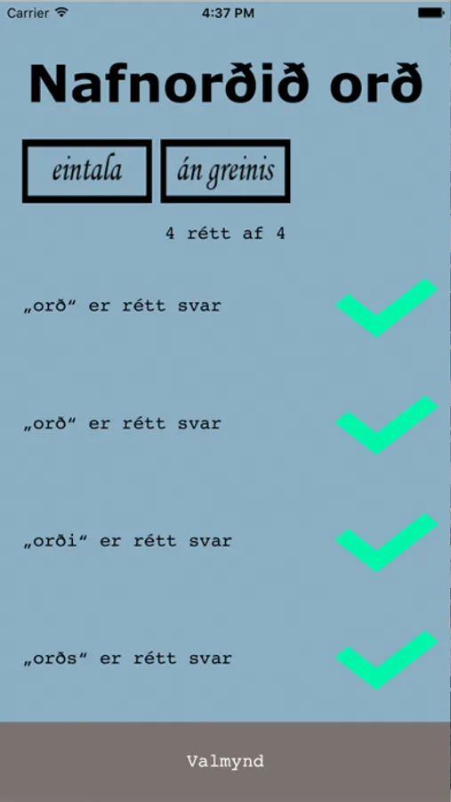 Orðið sem spurt er um getur verið í eintölu eða fleirtölu og með greini eða án greinis. Einnig er spurt um beygingu mannanafna og fornafna. Í lok leiks er sýnt graf með hlutfalli réttra svara.
