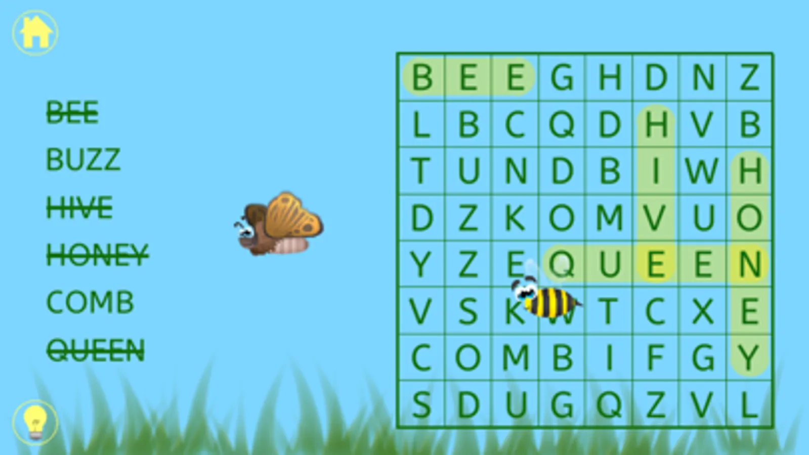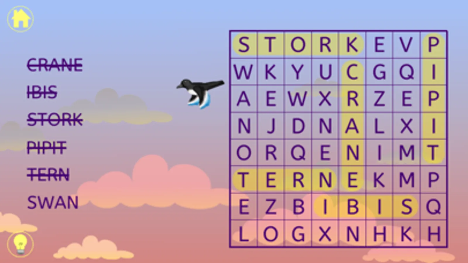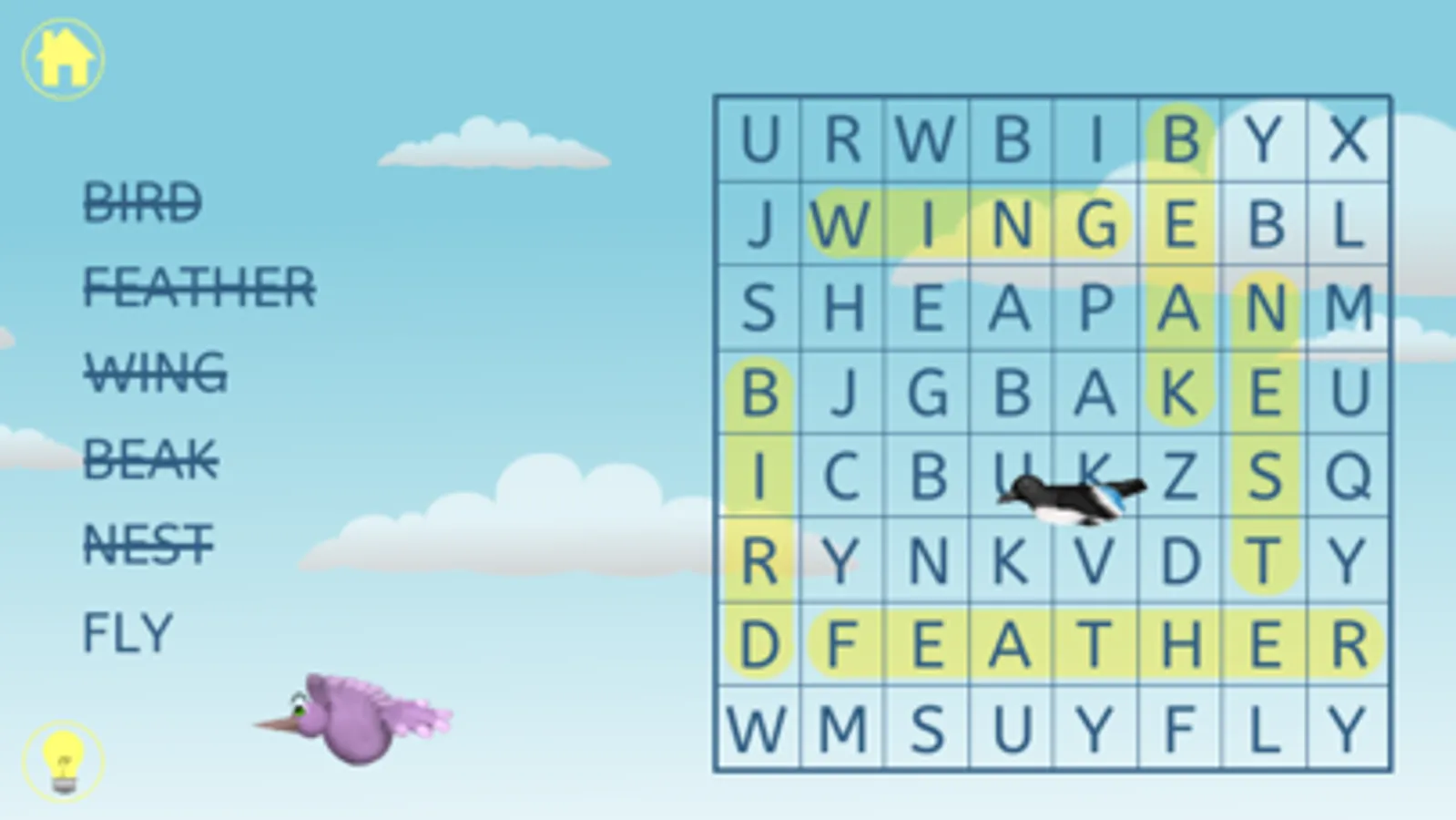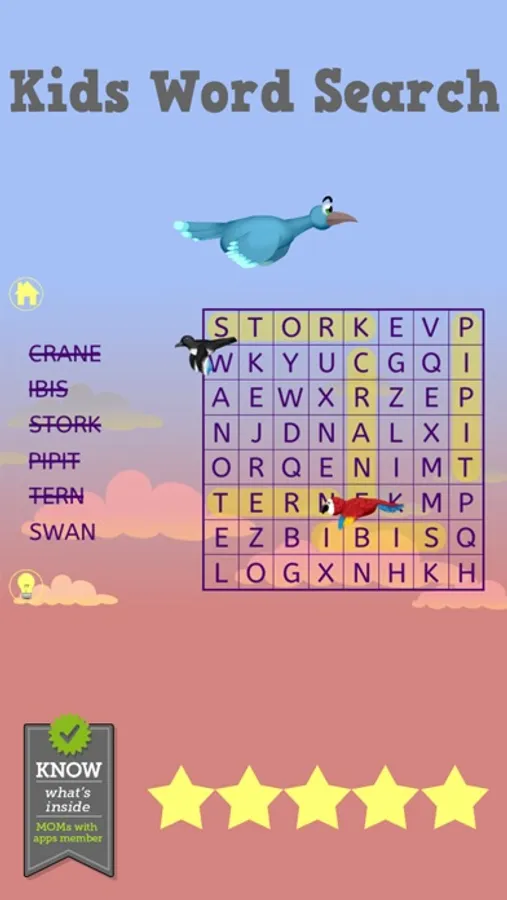 Word search with over 50 puzzles. Fun backgrounds with interactive characters as rewards for finding words. Tap the characters and watch them zip away. Hinting with spoken word and first letter highlighted to help budding readers improve their word recognition skills. Sound toggle on main menu allows silent play.