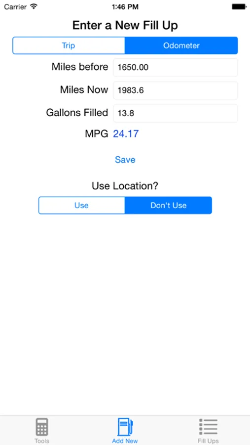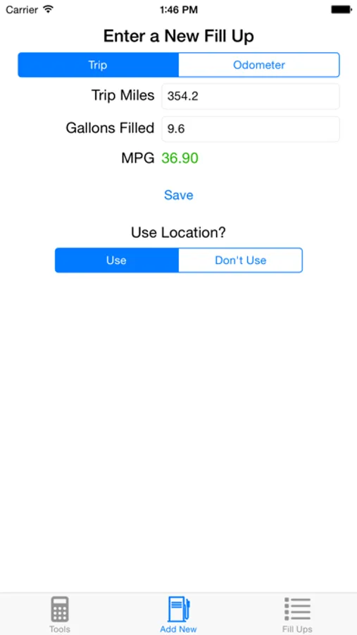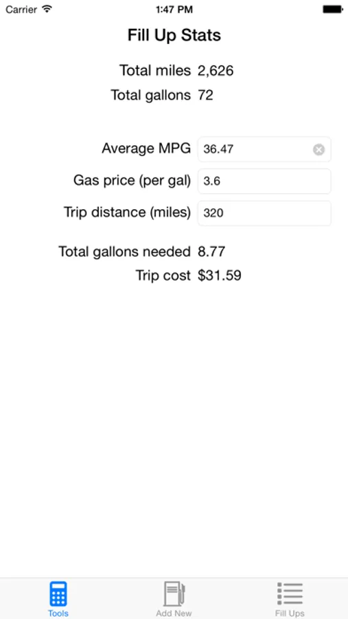 Built in calculator helps you plan better. Enter in the price per gallon and how far you need to go and Fill Up Tracker will estimate how many gallons you will need and the cost of the trip.