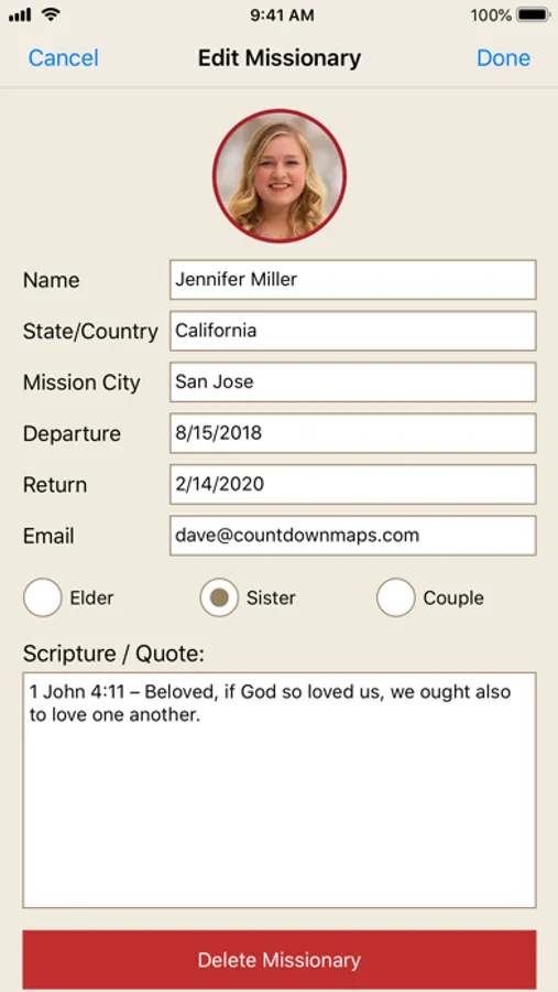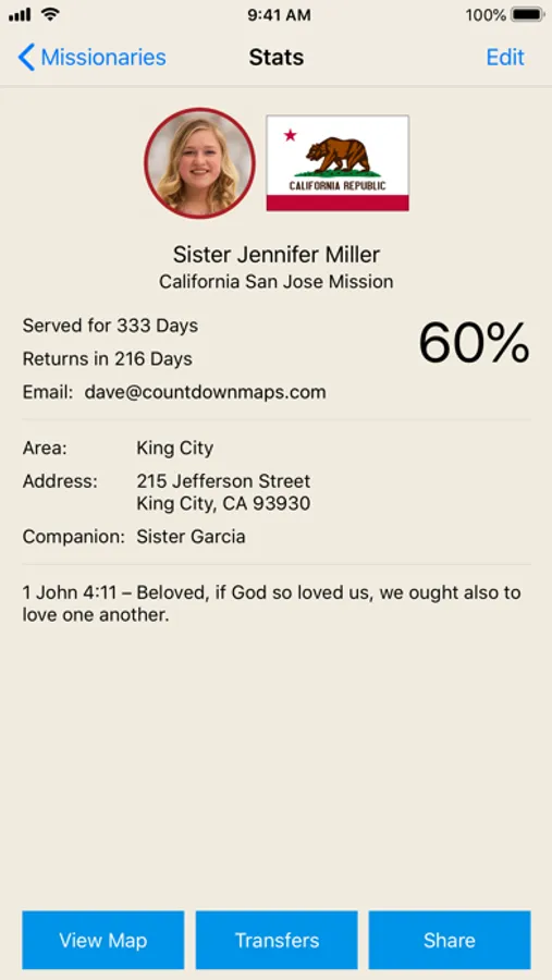 Missionary Stats – If you tap on a missionary from the list, you can see all of the information about that missionary including their picture, the flag of the state or country where they are serving, days served, days remaining, percent complete, email address, mailing address, current companion(s), and a favorite scripture or quote. The email address is also a direct link to your email, so that you can start an email to them from this view. You can also put in a future departure date and it will countdown the days until they leave.