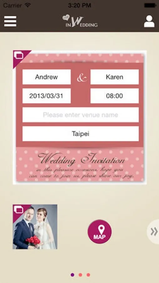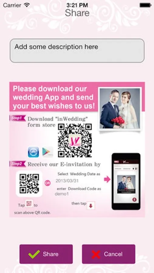 This is a special App for those who are going to marry. It allows you to customize your own wedding App, and let your friends and guests to download via inWedding App.