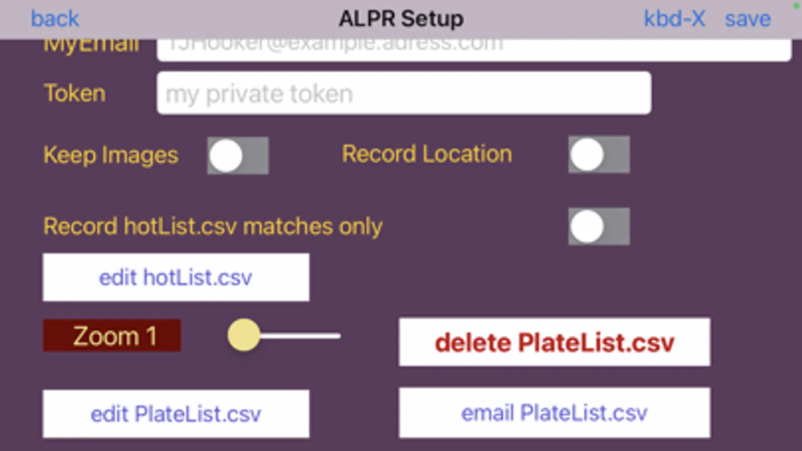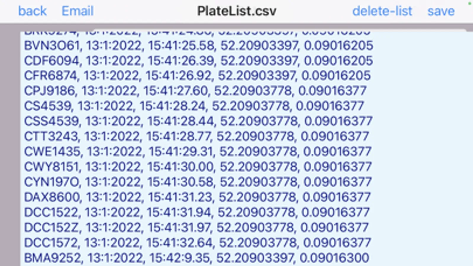 You can keep track of plate you have seen in PlateList.csv file and receive an alert when the app spots a plate form the hotList.csv file. The app can record GPS location information for each plate. If you are reading moving license plates you can use ISO mode to have direct control over shutter speed to eliminate motion blur.