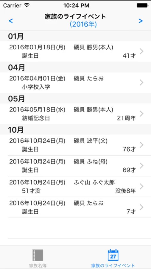 数年後の家族みんなの年齢を眺めたり、過去にさかのぼって表示することも出来ます。