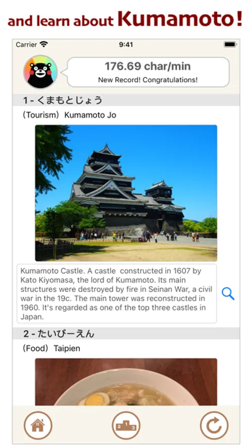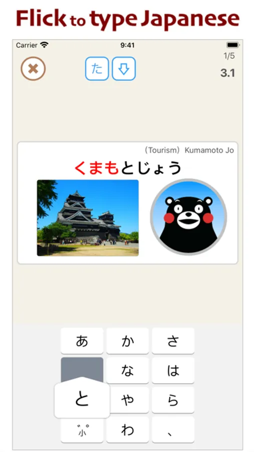 FlicKuma! is an app to improve your typing skills when you type Japanese with a flick keyboard. In this app, your tutor is Kumamon, the mascot of Kumamoto Prefecture, Japan, and you'll be typing words which he shows. All the words are related to Kumamoto, so you'll also learn about the area as you type!