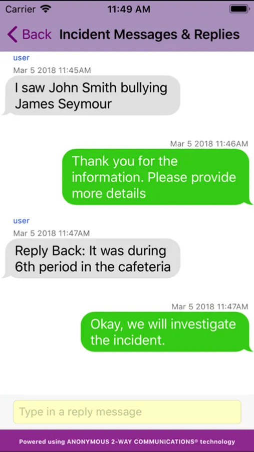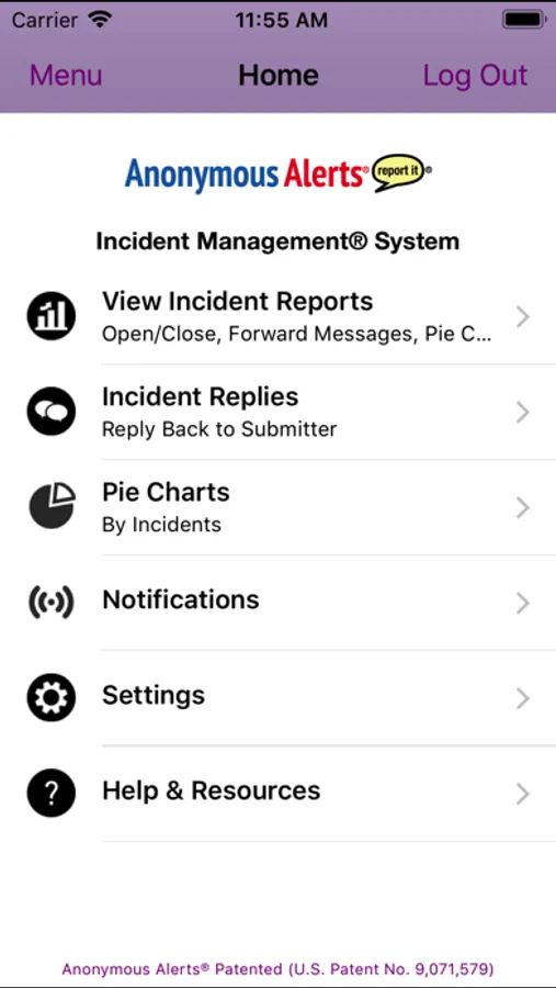 The Anonymous Alerts® Incident Management® App and system was designed for easy access by school campus officials to incident reports. Authorized campus personnel can communicate via anonymous 2-way communications® with a student or parent who has reported bullying, cyberbullying, self-harm, drugs, gang-related issues, guns/weapons in schools and more which may warrant immediate attention by school officials. The system is simple and secure for campus official’s use. The Anonymous Alerts® Incident Management® app is Patented (U.S. Patent No. 9,071,579).