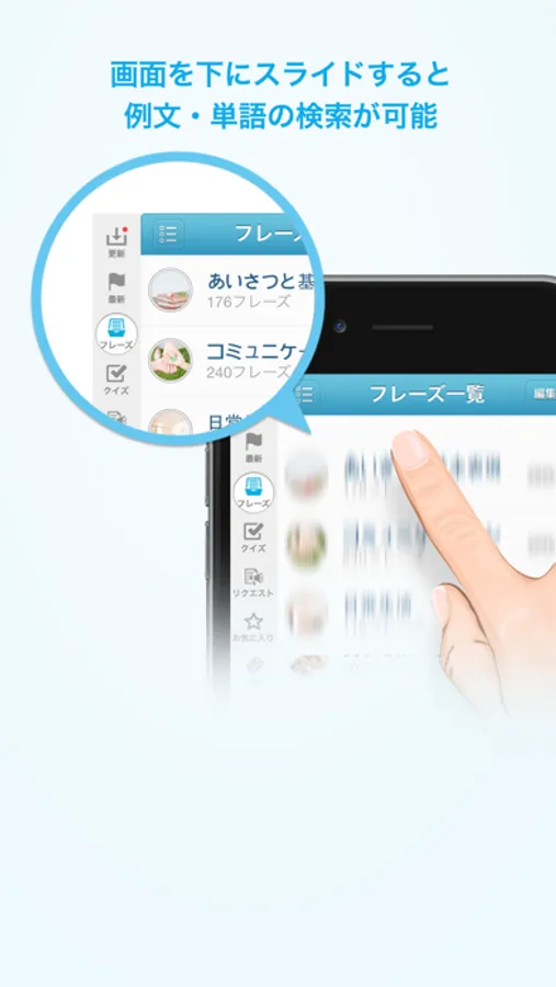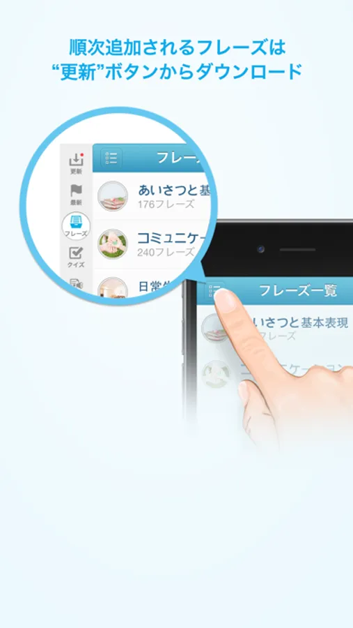 ※順次新しいフレーズを追加しているため、初回起動時は”更新”メニューからフレーズ・単語のダウンロードをお願いいたします。