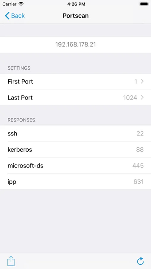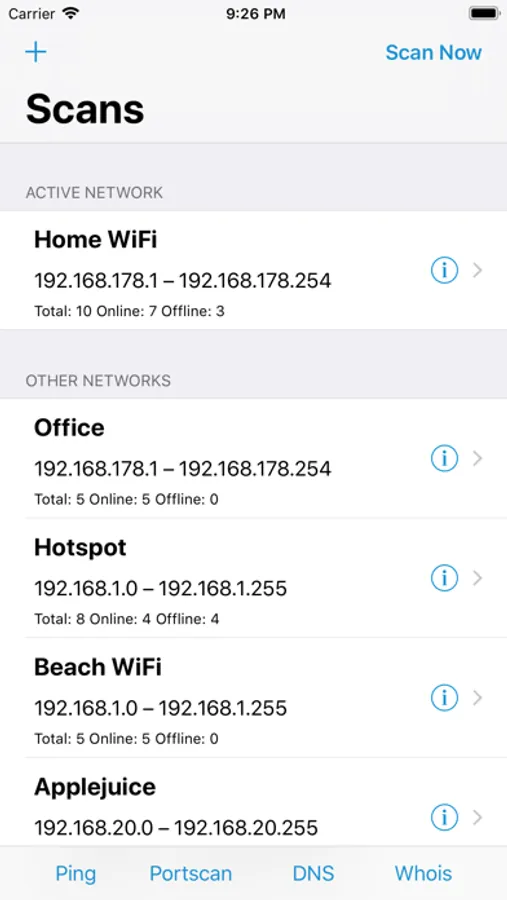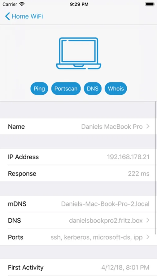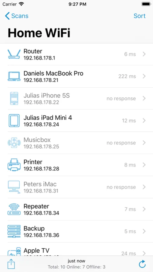 Once Network Radar has scanned your network, it lists all found devices. Each devices comes with detailed information such as IP address, DNS names, mDNS name, open ports, response time and more. Of cause you can also create scans with custom IP ranges. Every scan can be accessed at a later time, even when your device is not connected to it anymore.