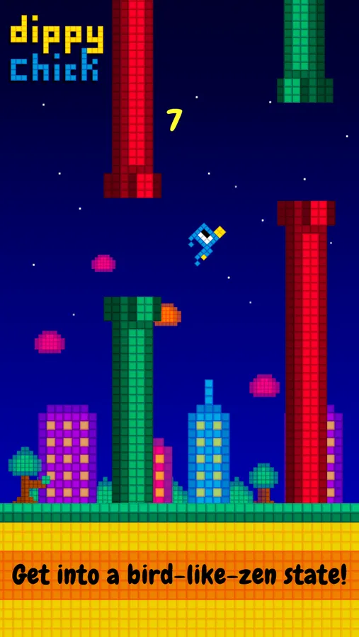 Keep tapping the screen to flap Dippy Chick's tiny pixel wings and skilfully avoid the pipes!