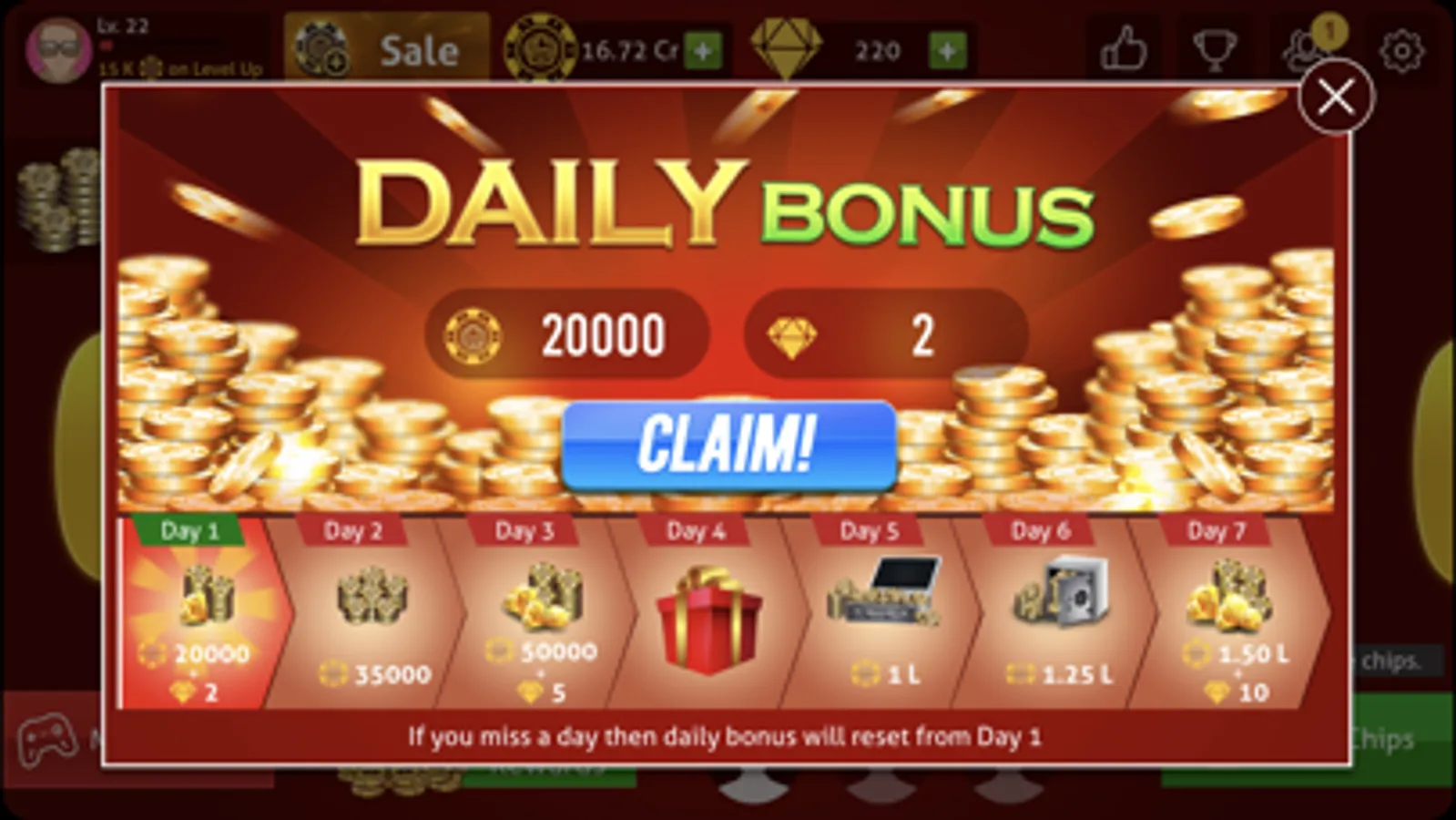 - Daily Rewards: Get upto 2,00,000 FREE BONUS CHIPS daily!