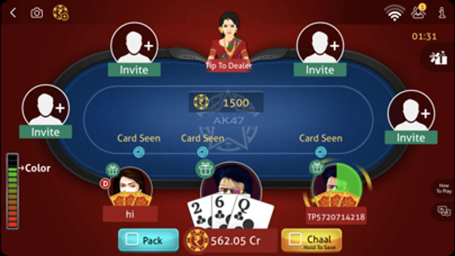 - 7 Player Private Table: Play Live teen patti online on a private table with 7 players