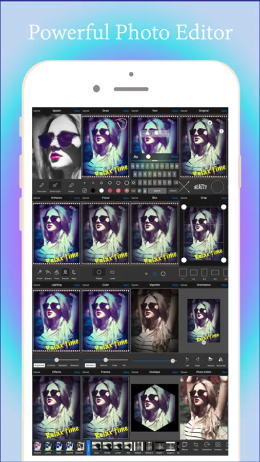 Features include: Effects, Crop, Orientation, Vignette, Blur, Focus, Enhance, Color, Lighting, Text, Meme, Splash, Sharpness, Draw, Whiten, Blemish, Redeye.