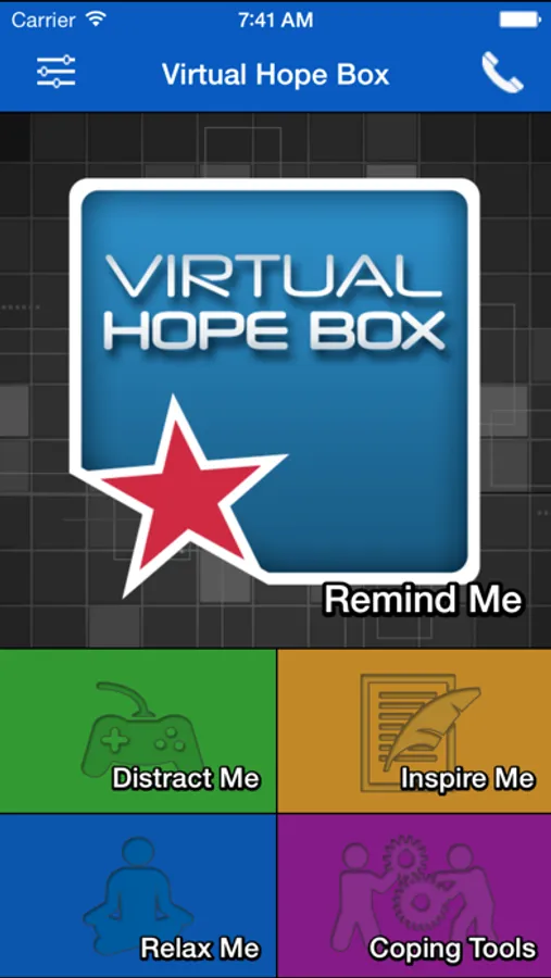 The Virtual Hope Box (VHB) is a smartphone application designed for use by patients and their behavioral health providers as an accessory to treatment. The VHB contains simple tools to help patients with coping, relaxation, distraction, and positive thinking. Patients and providers can work together to personalize the VHB content on the patient's own smartphone according to the patient's specific needs. The patient can then use the VHB away from clinic, continuing to add or change content as needed.