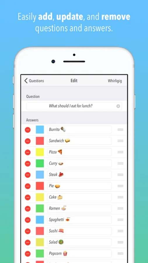 Do you ever need help making decisions? Well Whirligig can help! Whirligig is a customizable spinning selector. Just give it a question and some possible answers then give Whirligig a spin to reveal your destiny.