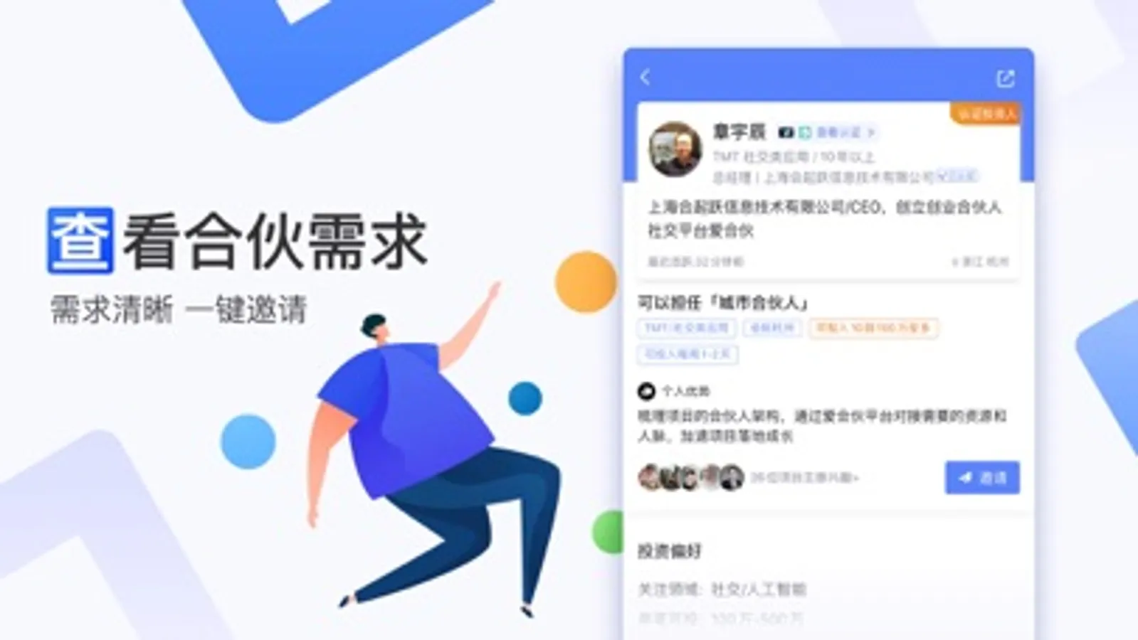 爱合伙坚持创业先要找到合伙人。“开放合作,寻求互补,利益共享”是社群的创业观。全职或兼职创业者、新兴行业企业家、传统生意老板、知名企业高管、职场精英,大咖投资人和创投服务机构都在用爱合伙,他们正在寻找技术合伙人、产品合伙人、市场合伙人、设计合伙人、运营合伙人,投资人。