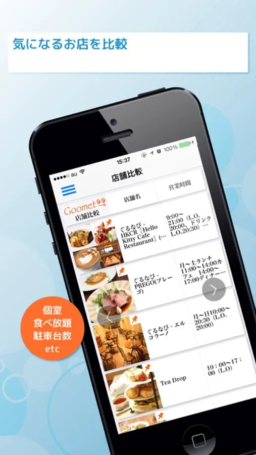 Goomet(ぐーめ)は、複数のメジャーな飲食検索サイトを横断的にお好きな条件でお店を検索できます。気になるお店の情報をピックアップして他のお店と比較できます。さらに便利なワンタップで予約できる機能を搭載しました