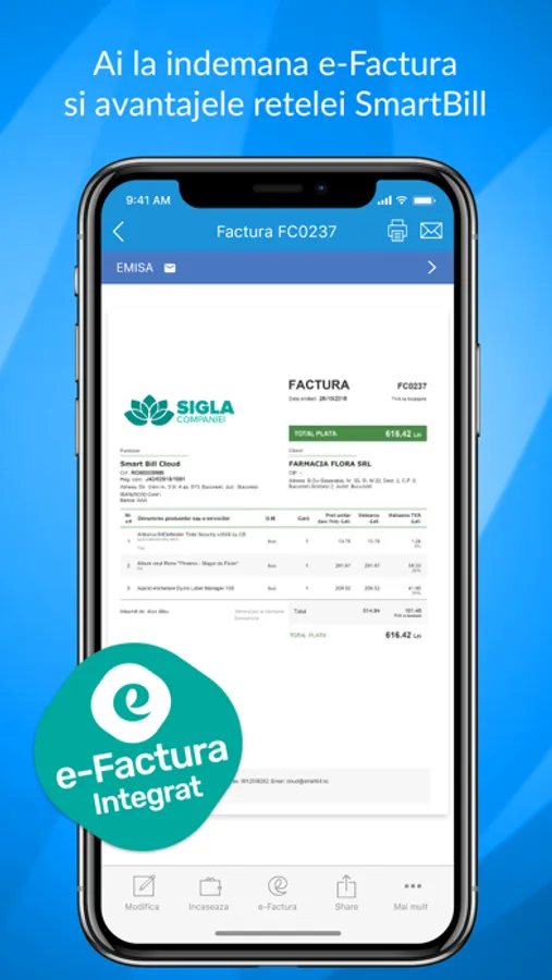 • Integrat cu e-Factura - 99.8% din e-facturi sunt validate de ANAF din prima, fara erori