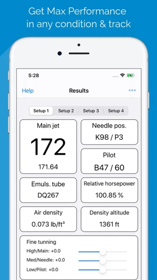 - Results: in this tab, four different jetting setups are shown. These data are calculated depending on the weather conditions and the engine and track configuration given in the next tabs. For each jetting setup, the following values are given: main jet, emulsion tube, needle type and clip position, inner pilot jet (iddle diffuser) and outer pilot jet (iddle jet). Under the recommended main jet, the calculated real value with decimals is shown. Besides this jetting information, the air density, density altitude and relative horsepower are shown too. In addition, this tab lets do a fine tunning adjustment for the main (high), needle (mid) and pilot (low) circuits for each jetting setup to adapt to the concrete engine.