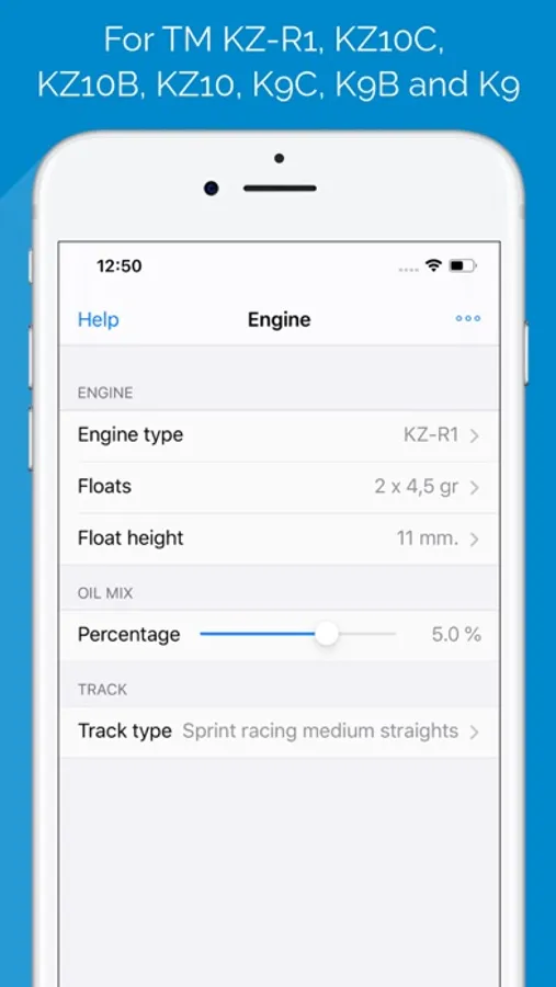 - Engine: you can configure in this screen the information about the engine, that is, the engine model (K9, K9B, K9C, KZ10, KZ10B, KZ10C, KZ-R1), the float type and height, the oil mix ratio and the type of the circuit (spring or road racing, short or long). Depending of the track type, the jetting setups will be adapted.