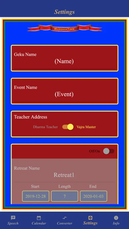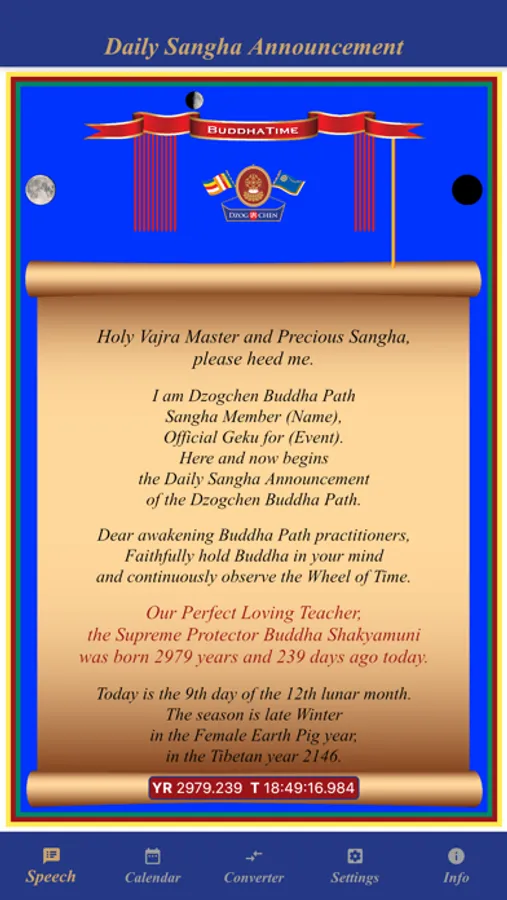 BuddhaTime provides up to date information for the Geku during Dzogchen practice of the Buddha Path. BuddhaTime incudes the Geku speech, conversion of the western calendar dates to the Tibetan calendar, and a listing of major Dzogchen/Tibetan holidays.
