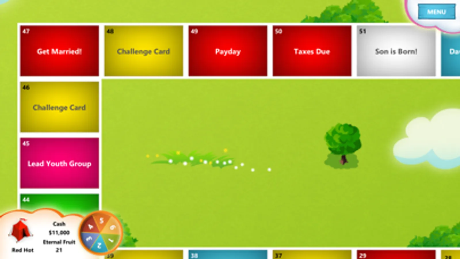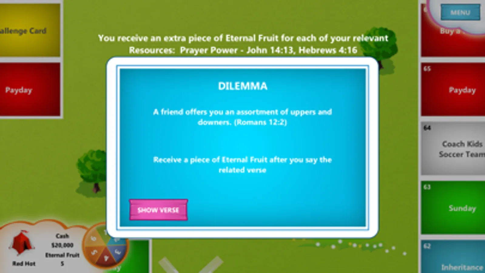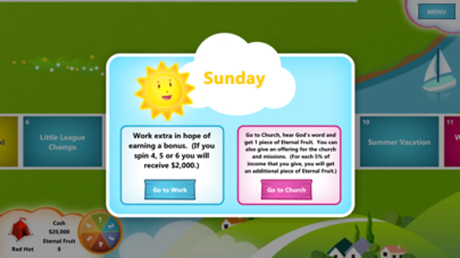 -Land on a ‘Sunday’ where you have a choice of attending church which gains you eternal fruit, or working overtime in hopes of getting a bonus.