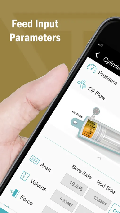 - By entering the requisite dimensions of the cylinder and parameters like the pressure and oil flow the user would be able to calculate the areas & volumes in the cylinder, extraction & retraction forces, velocity, time, outflow and ratio. The output is derived on both the piston and rod side of the cylinder