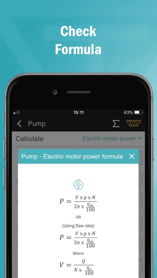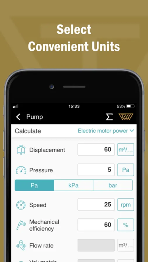 - The app enables the calculation of displacement, flow rate, electric motor power and total efficiency in Pump section