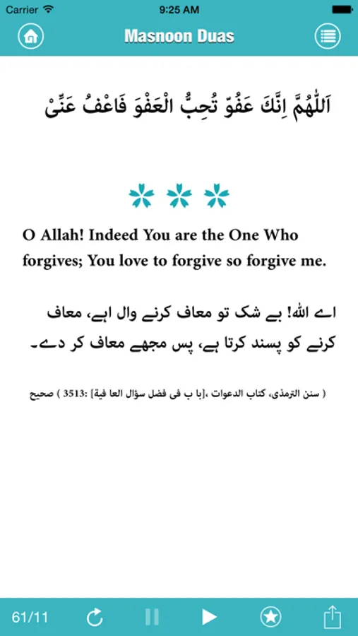 Quranic and Masnoon Duas is a collection of supplications collected from the Quran and Sunnah. These beneficial supplications from the Qur’an and authentic Hadith of the Prophet (peace be upon him), help one protect themselves when afflicted by anxiety, sickness and sorrow. The application is based on the book ‘Quranic and Masnoon Duas’ complied by Dr. Farhat Hashmi.