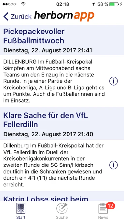Lokalsport: Eine eigene Rubrik zeigt die aktuellsten Meldungen aus allen relevanten Bereichen.