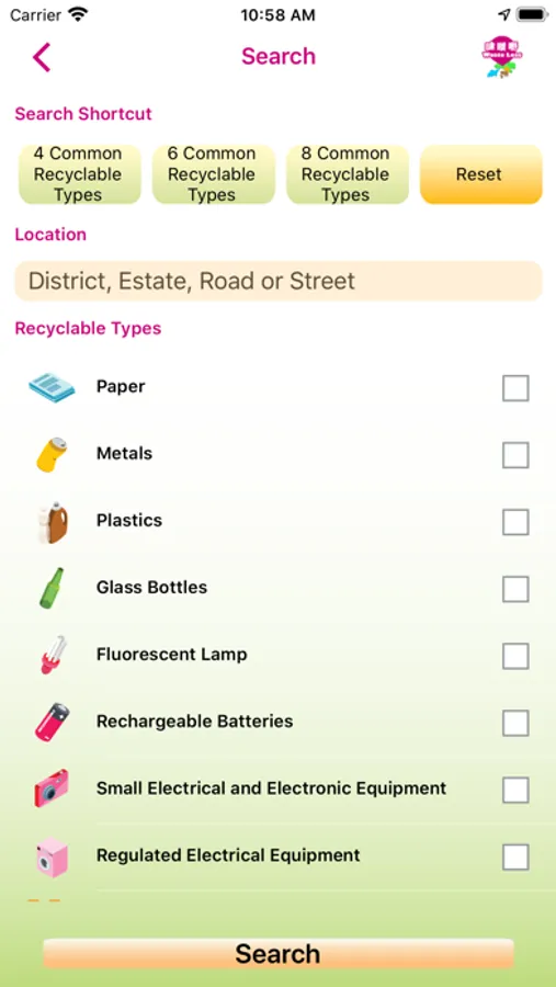- “Search” function to find out the most suitable collection points for recyclable items;