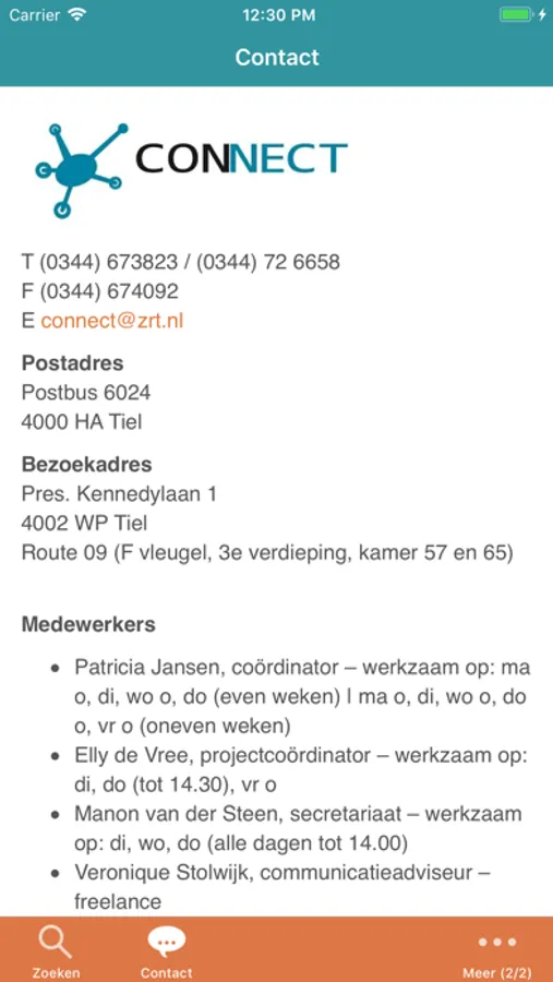CONNECT is een Medisch Coördinerend Centrum in de regio Rivierenland, opgericht als stichting door de Coöperatieve Huisartsen Vereniging Gelders Rivierenland, Ziekenhuis Rivierenland, en de medische staf van Ziekenhuis Rivierenland. CONNECT heeft als doel de samenwerking in de zorg te bevorderen en daarmee een bijdrage te leveren aan betere afstemming tussen de zorgverleners in de eerste en tweede lijn. Deze CONNECT app is als middel ontworpen om hier een bijdrage aan te leveren, en is bedoeld voor alle huisartsen, medisch specialisten, specialisten ouderengeneeskunde en apothekers in de regio. De app is als presentje gekoppeld aan de Sandwichcursus 2014.