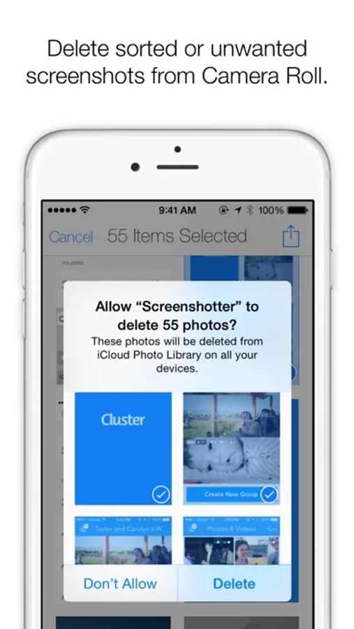 • Open the app and give it access to your camera roll. Screenshotter automatically displays your screenshots separate from your photos.