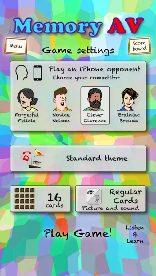 Start with the classic game Memory (also called Concentration) and add an exciting new twist. What have you got? A fun, addicting, memory-challenging game: Memory AV.